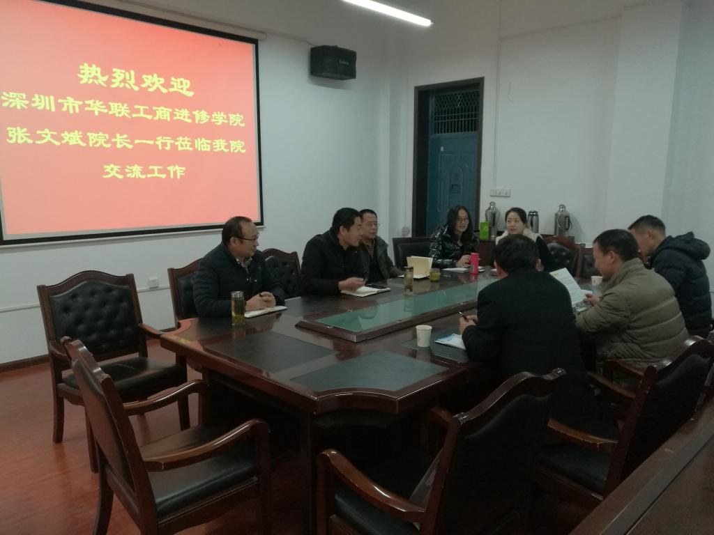 2018年12月27日上午,深圳市华联工商进修学院院长张文斌一行三人来taptap点点继续教育学院走访、调研。继续教育学院副院长刘玉森,培训部、教务科、办公室负责人等参加了座谈会,会议由刘玉森主持。