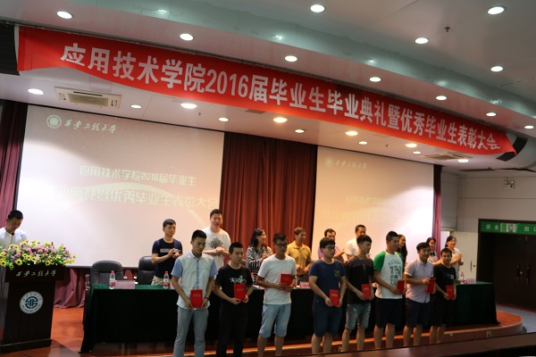 毕业典礼在雄壮的国歌声中拉开帷幕。院长马保科发表了热情洋溢的致辞。他热情祝贺毕业生完成学业,同时语重心长地向全体毕业生提出了殷切的希望和要求,也希望毕业生常回家看看,继续关心和支持母校的发展。党总支副书记仝燕宣读了学院2016届优秀毕业生、优秀学生干部名单,副院长宣读了学院参加2016年陕西省专升本考试录取情况。主席台嘉宾为获奖学生颁发了荣誉证书。教师代表王惠欣向毕业生深情寄语,13级染整技术专业孟玮、13级计算机科学技术专业尚科言代表全体毕业生发言,对母校多年来的培养表示衷心的感谢。党总支书记张智荣讲话,号召广大毕业生不辜负学院的期望,以百倍的热情和昂扬的斗志,投入到今后的学习和工作中,奋发图强。