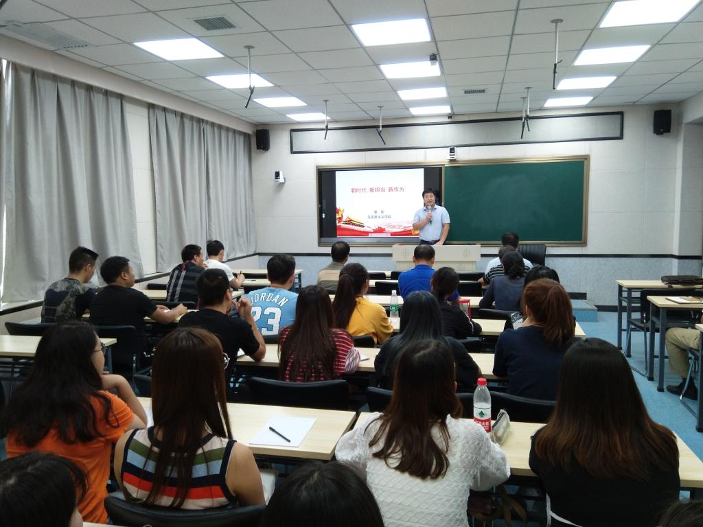 2018年9月11日下午,taptap点点官网党总支邀请马克思主义学院教师、“陕西省思政课教学标兵”郭松老师在金花校区主楼西配楼411室作了题为《新时代、新担当、新作为》主题报告。taptap点点官网全体党员及部分学生入党积极分子参加了此次学习活动,报告由taptap点点官网党总支书记王宇主持。