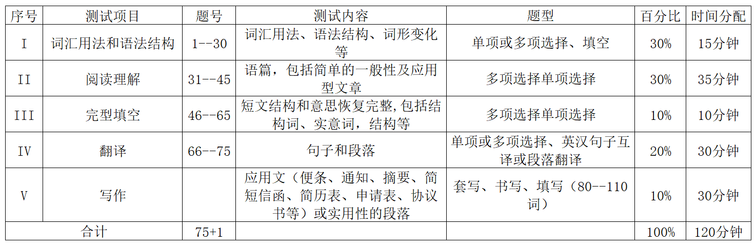 成人高等教育本科毕业生申请学士学位英语水平考试的试卷结构、试题类型、内容分布和分值比例见表1。